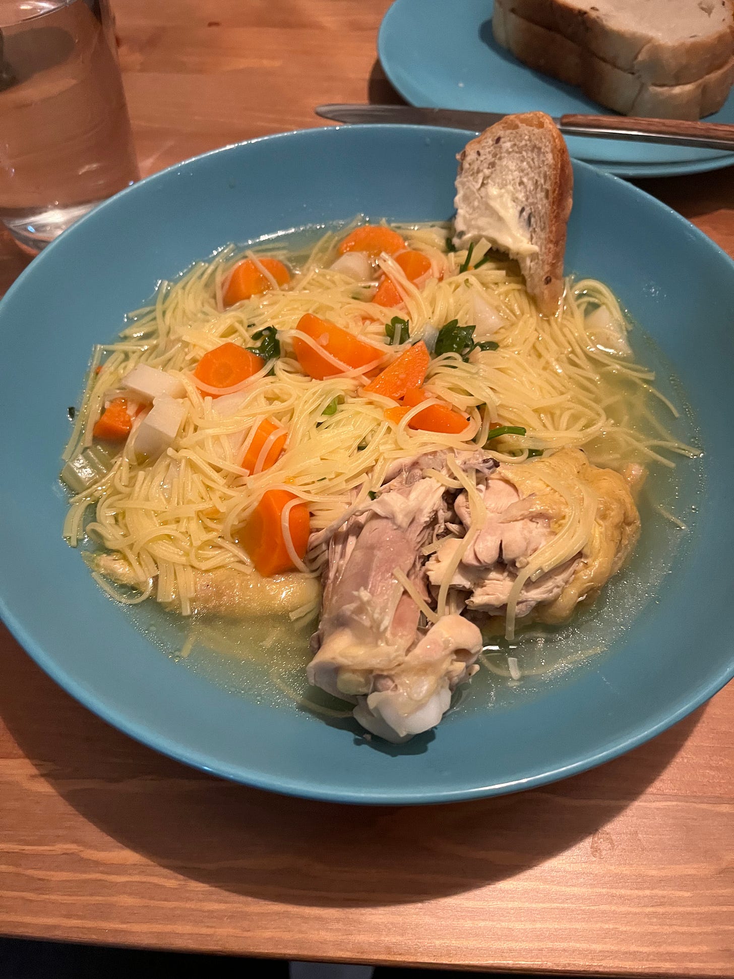 I tend to take recipes as suggestions. After all, isn’t that how someone invented a recipe? So here’s how I make it. After sautéing some onions in olive oil, I brown both sides of the chicken in the pot. Then I add some carrots, cover it with boiling water from the kettle and let it cook for 20-25 minutes. The last step is to add some fresh parsley and thin, quick-cooking noodles.